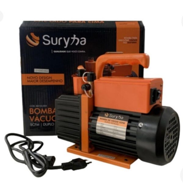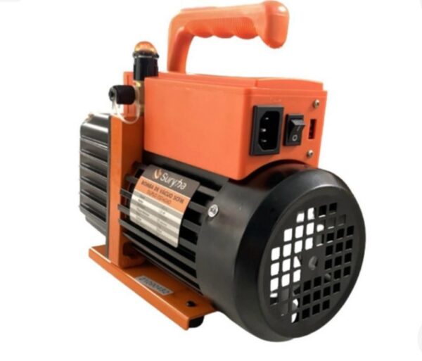 A Bomba de Vácuo 5CFM Duplo Estágio Suryha é ideal para realização de vácuo em sistemas de refrigeração e ar condicionado. Com design inovador, é compacta e extremamente potente, contando com dois estágios para atingir um vácuo mais rápido e profundo. Sua função é evitar que gases e umidade presentes no sistema causem danos ao compressor e evaporadora. A mistura de fluido refrigerante com água gera um composto ácido capaz de oxidar todas as partes metálicas internas do sistema, obstruindo os capilares.